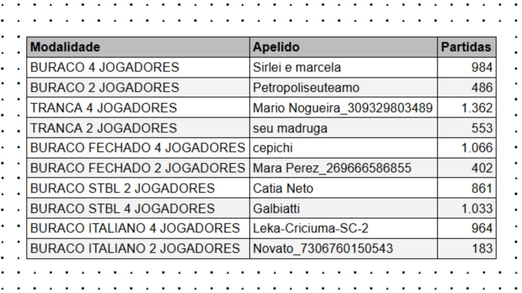 Agora, chegou o momento de revelar a lista dos jogadores que disputaram o maior número de jogos em cada categoria.
