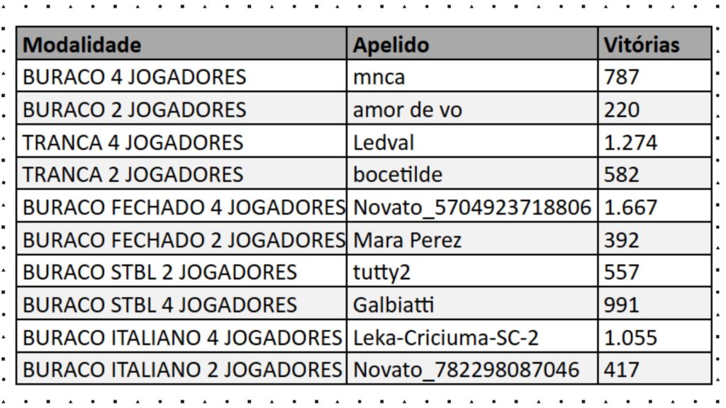 Hoje é dia de celebrar em grande estilo: vamos revelar os nomes daqueles que conquistaram o maior número de vitórias em cada modalidade. Verdadeiros campeões que se destacaram nas disputas e merecem todos os aplausos!