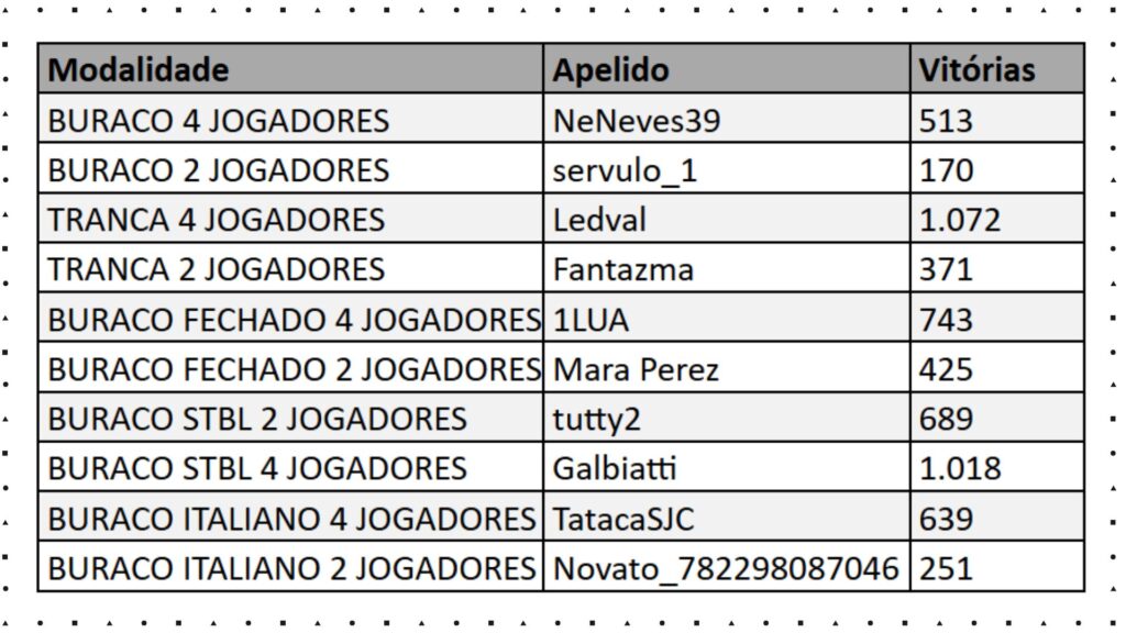 Hoje é dia de celebrar em grande estilo: vamos revelar os nomes daqueles que conquistaram o maior número de vitórias em cada modalidade. Verdadeiros campeões que se destacaram nas disputas e merecem todos os aplausos!
