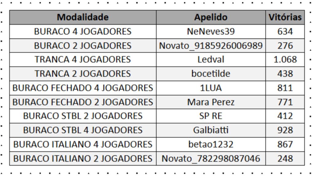 Hoje é dia de celebrar em grande estilo: vamos revelar os nomes daqueles que conquistaram o maior número de vitórias em cada modalidade. Verdadeiros campeões que se destacaram nas disputas e merecem todos os aplausos!