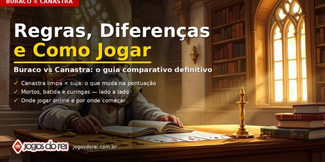 Se você pesquisou “buraco canastra”, provavelmente está com uma das três dúvidas: o que é a tal “canastra” dentro do Buraco, qual a diferença entre os dois jogos, ou simplesmente como começar a jogar online. Este hub responde os três — usando as regras oficiais do Jogos do Rei, sem inventar variação que ninguém usa.