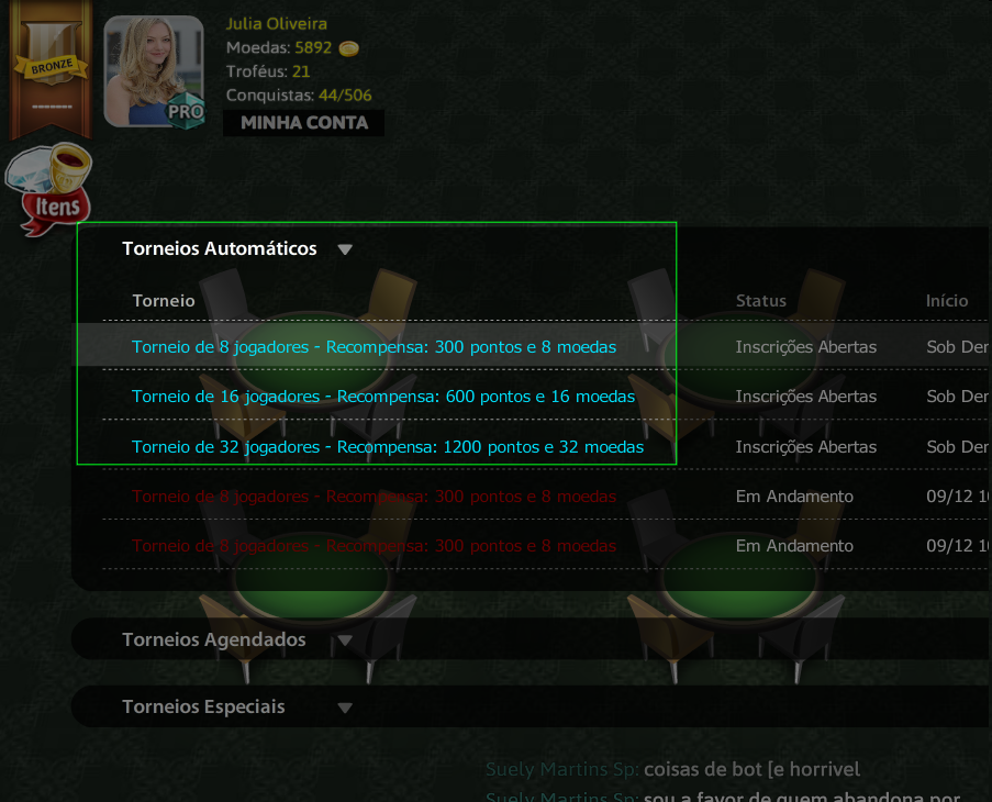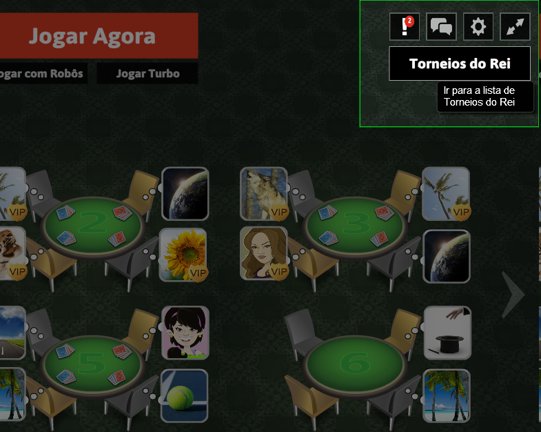 Para participar de um torneio, após entrar em um jogo, clique em "Torneios do Rei".