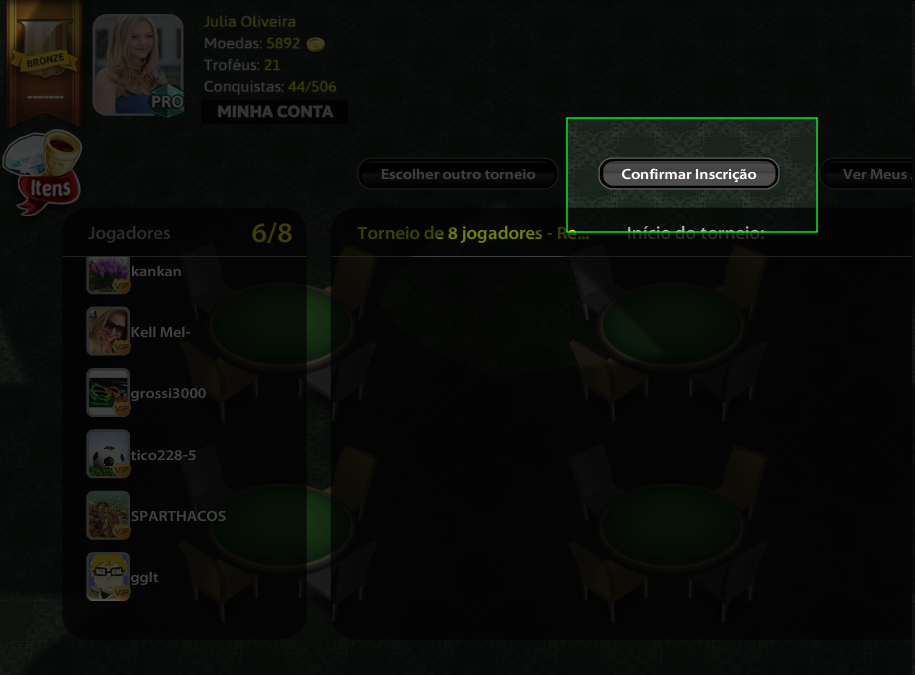 Na tela seguinte basta clicar em "Confirmar Inscrição" e esperar o torneio ter o número necessário de pessoas para começar.