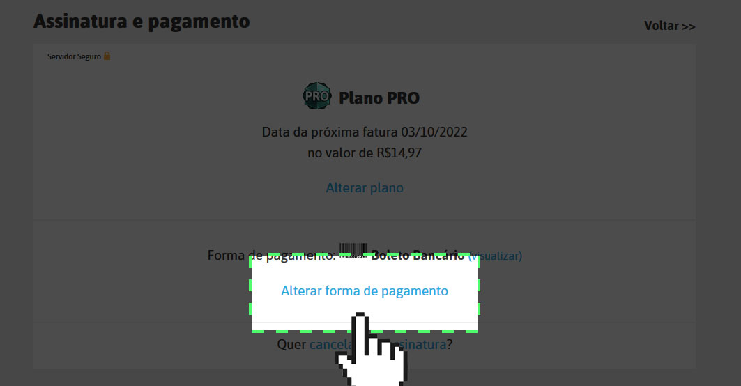 Caso você já tenha uma assinatura, verá os detalhes dela. Clique em Alterar forma de pagamento para mostrar as opções disponíveis.