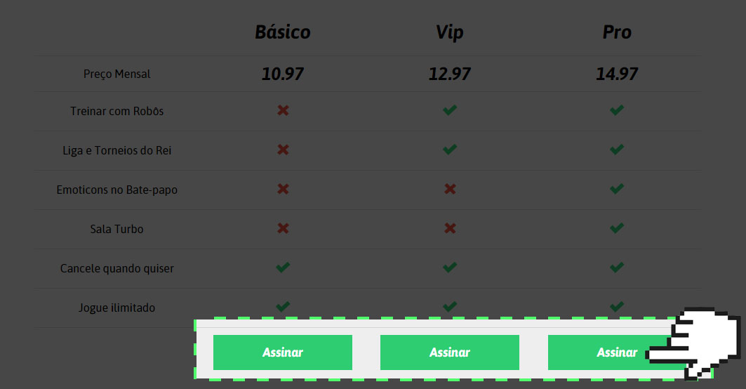 Se você vir a tela abaixo com o comparativo dos nossos planos, é porque não tem uma assinatura ativa ainda. Escolha o melhor plano para você e clique em Assinar.