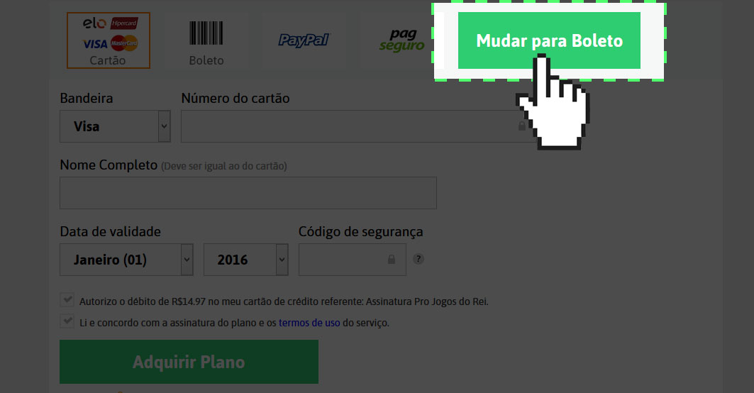 Você terá as opções disponíveis para pagamento. Clique em Mudar para Boleto.